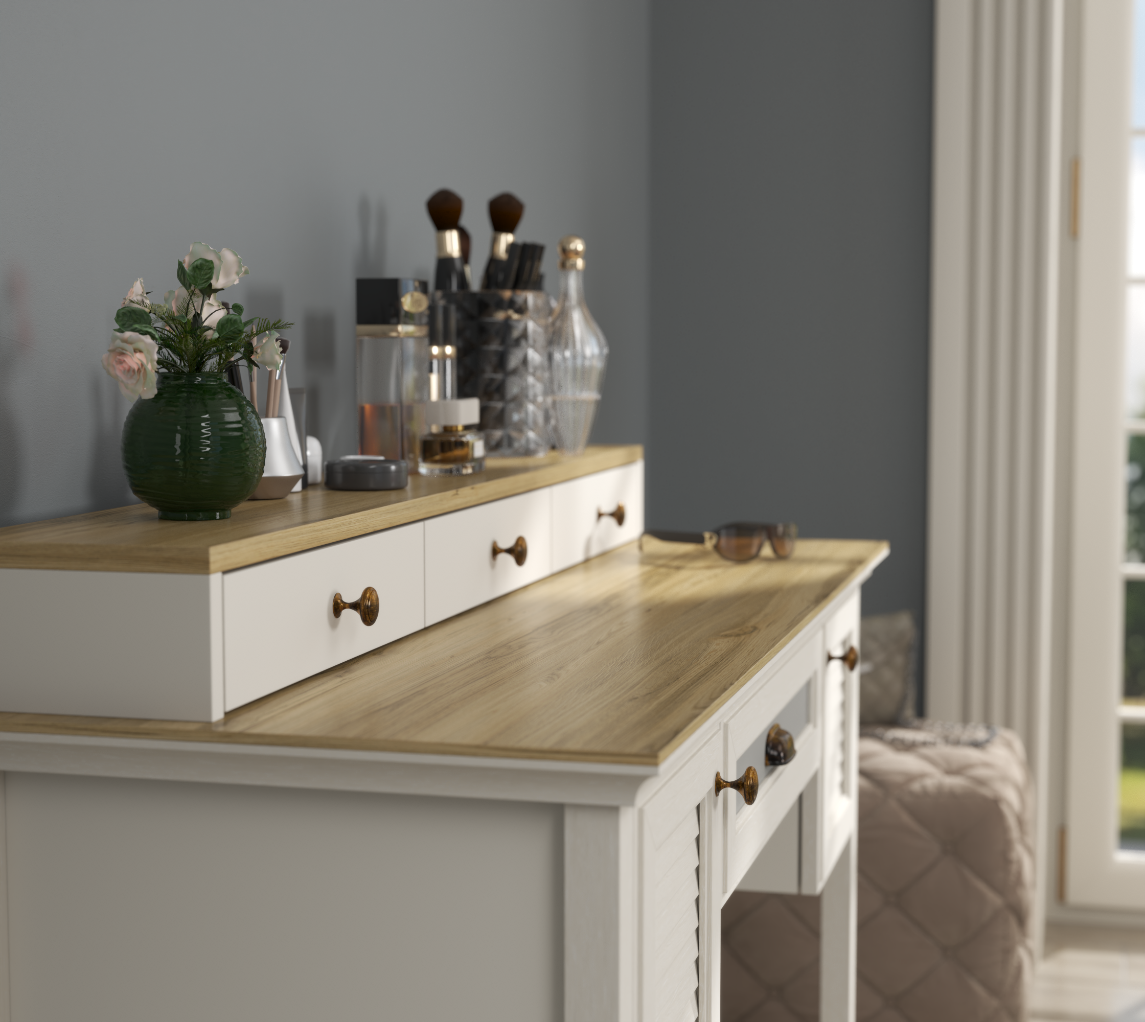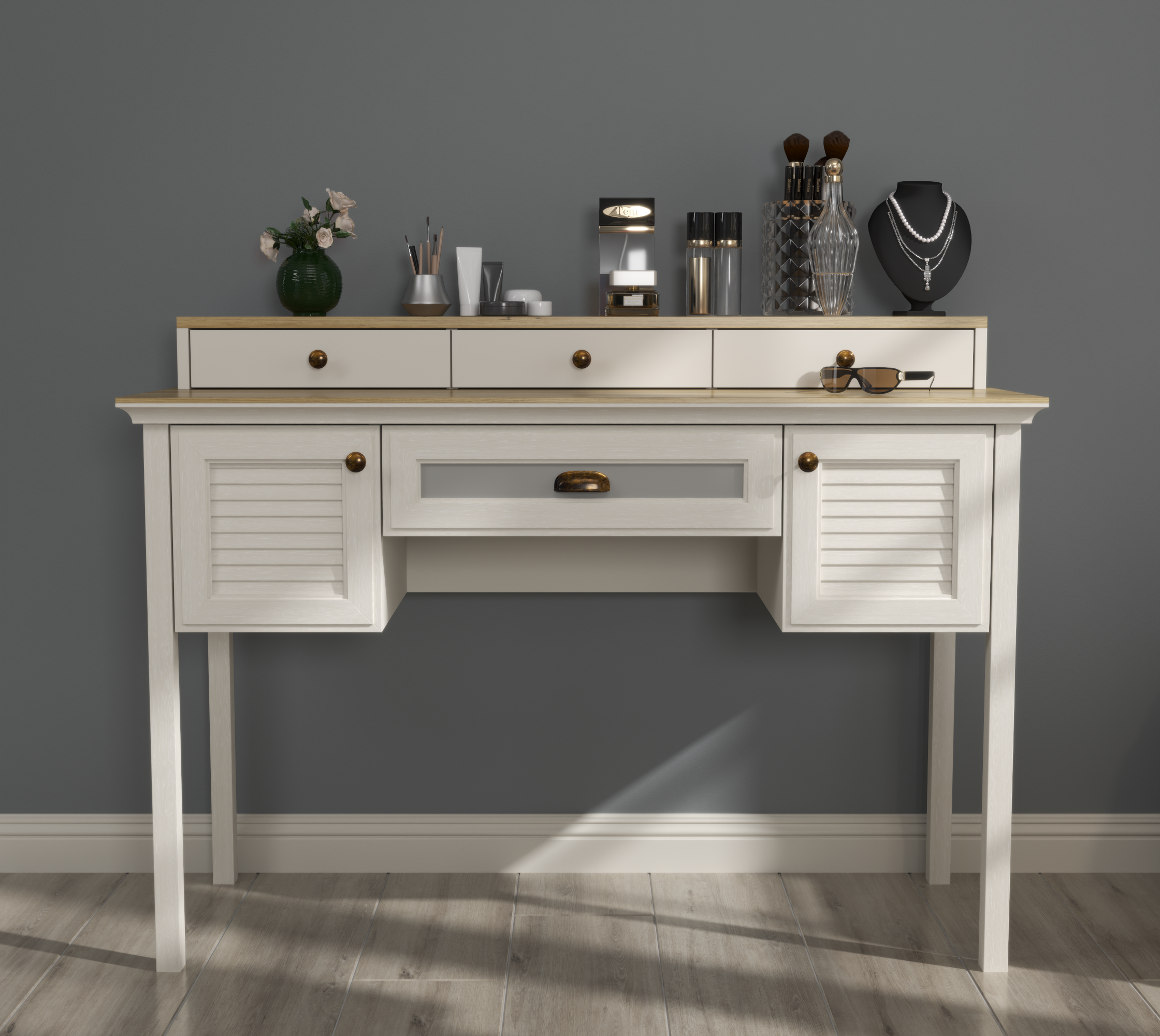Bu özel tasarım makyaj masası, şıklığı ve işlevselliği bir araya getirerek size kusursuz bir hazırlık deneyimi sunar. Geniş yüzey alanı sayesinde tüm makyaj ürünlerinize ve aksesuarlarınıza kolayca yer açar. Aynalı yapısı ve raf detaylarıyla hem düzenli hem estetik bir kullanım sağlar.